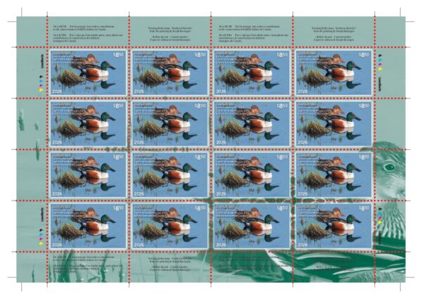 2026 “Evening Reflections – Northern Shoveler”, by Joseph Koensgen 16-Pane Stamp Sheet